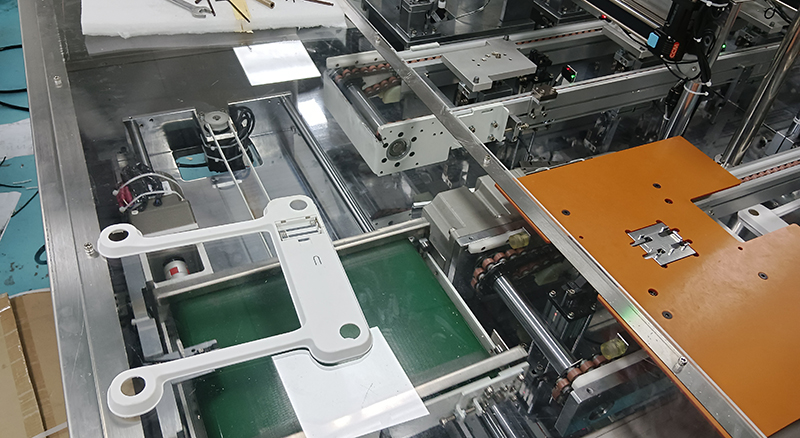 2.2、抓取機(jī)構(gòu)將彈片精確地搬運到人體秤工件(通常是裝配有電池盒或PCB板的秤體/底殼)的預(yù)定安裝位置上方。